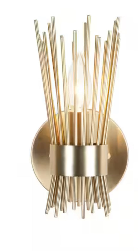 Sale price $225.00 Regular price $460.00Unit priceUnavailableIn stock (17 units) 10 in. 1-Light Brushed Gold Sconce with Open Rod Metal Shade