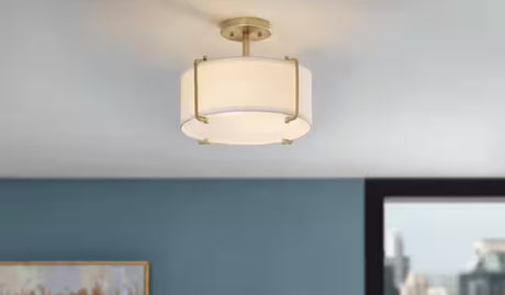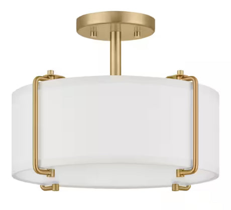 $185.00Unit price /UnavailableVery low stock (1 unit)Brookley 14 in. 2-Light Brushed Gold Semi-Flush Mount with White Fabric Shade