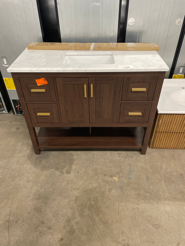 Sonia 43 in. Single Sink Freestanding Walnut Bath Vanity with White Engineered Stone Top and Backsplash Assembled is backordered and will ship as soon as it is back in stock.