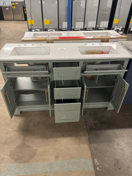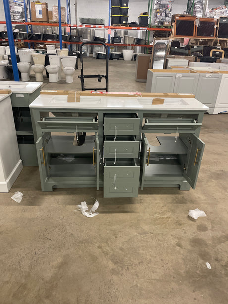 Regular price $660.00Unit priceUnavailableVery low stock (1 unit)Doveton 60 in. Double Sink Sage Green Bath Vanity with White Engineered Stone Top (Assembled)