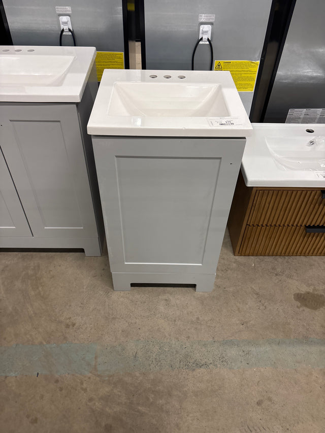 18 in. W x 17 in. D x 33 in. H Single Sink Freestanding Bath Vanity in Pearl Gray with White Cultured Marble Top is backordered and will ship as soon as it is back in stock.