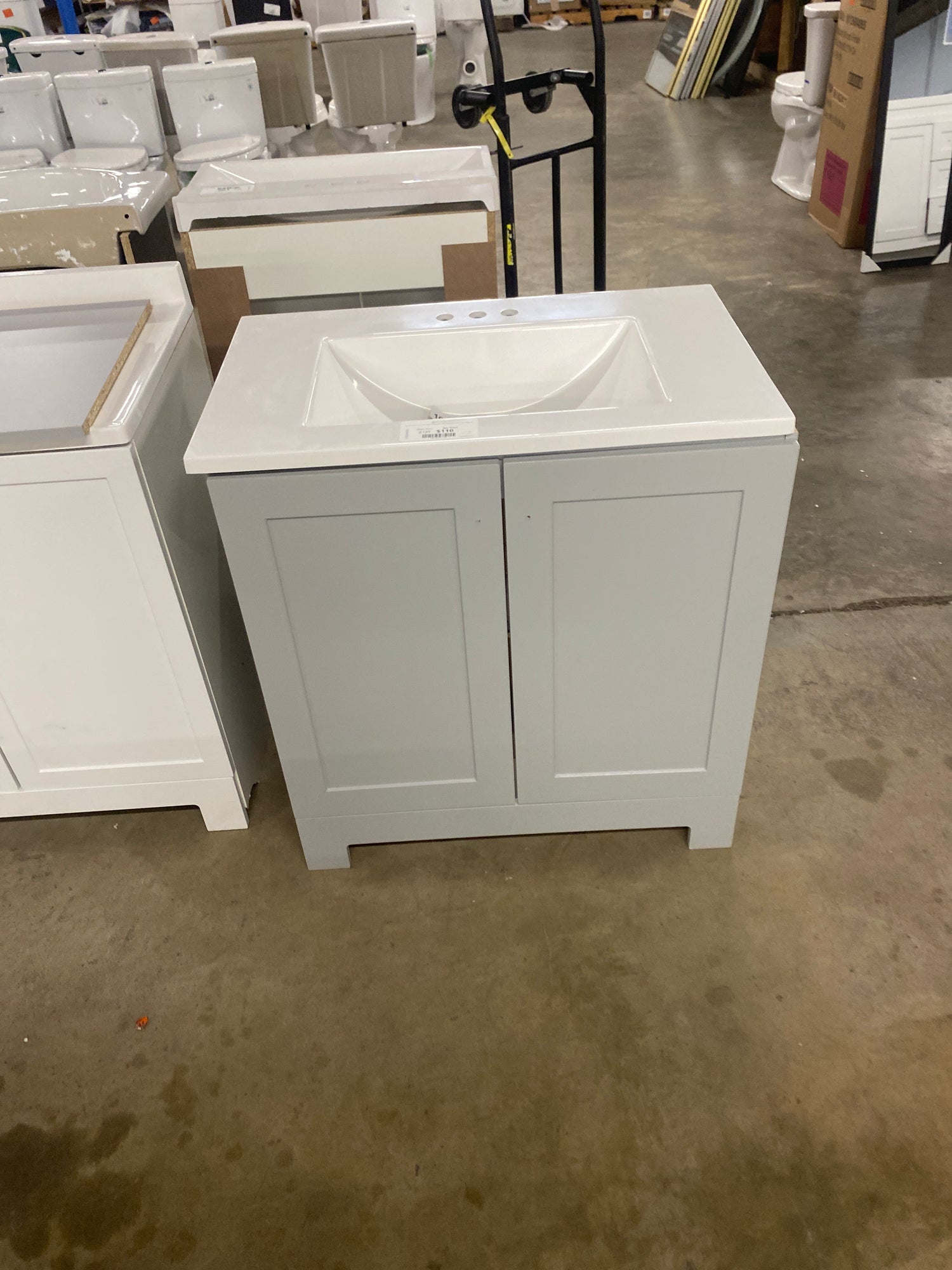 30 in. W x 19 in. D x 33 in. H Single Sink Freestanding Bath Vanity in Pearl Gray with White Cultured Marble Top is backordered and will ship as soon as it is back in stock.