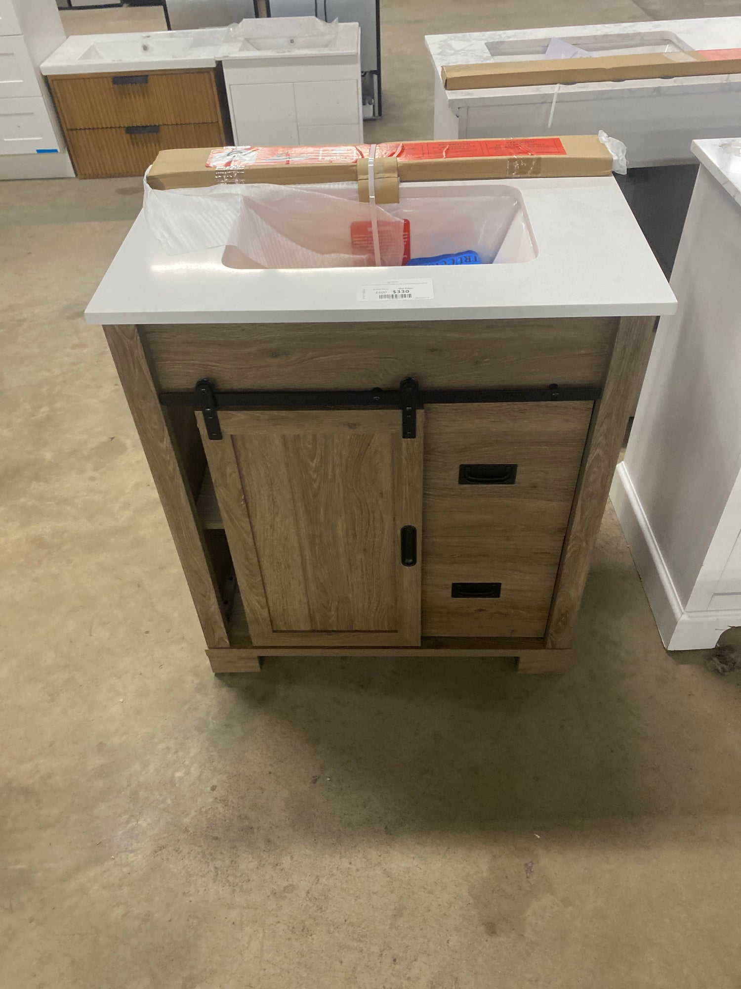 Brindley 30 in. W x 20 in. D x 35 in. H Single Sink Freestanding Vanity Aged Oak with Veined White Engineered Stone Top is backordered and will ship as soon as it is back in stock.