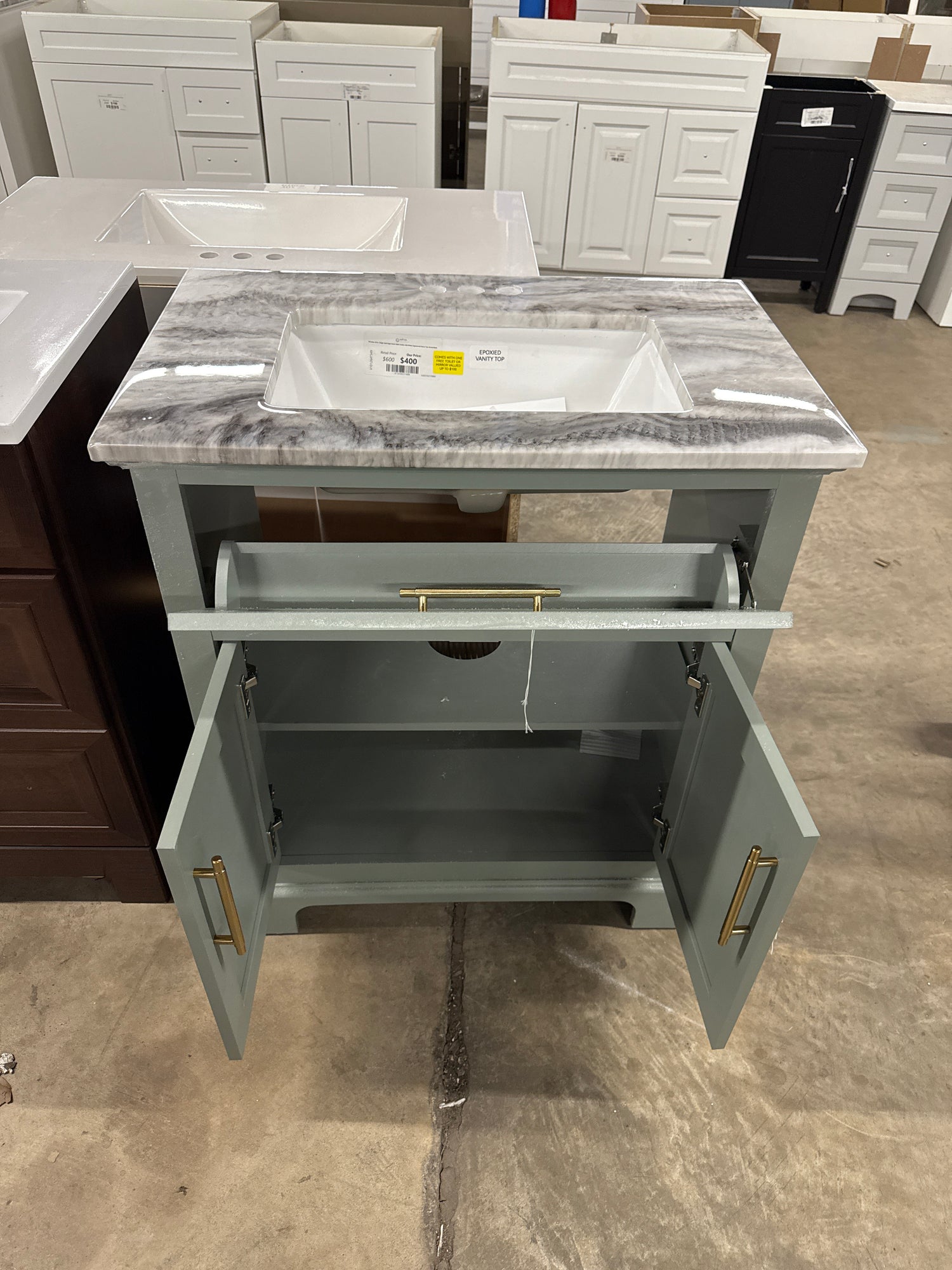 Doveton 30 in. Single Sink Sage Green Bath Vanity with White Engineered Stone Top (Comes with 1 Free Toilet or Mirror Valued Up to $100) is backordered and will ship as soon as it is back in stock.