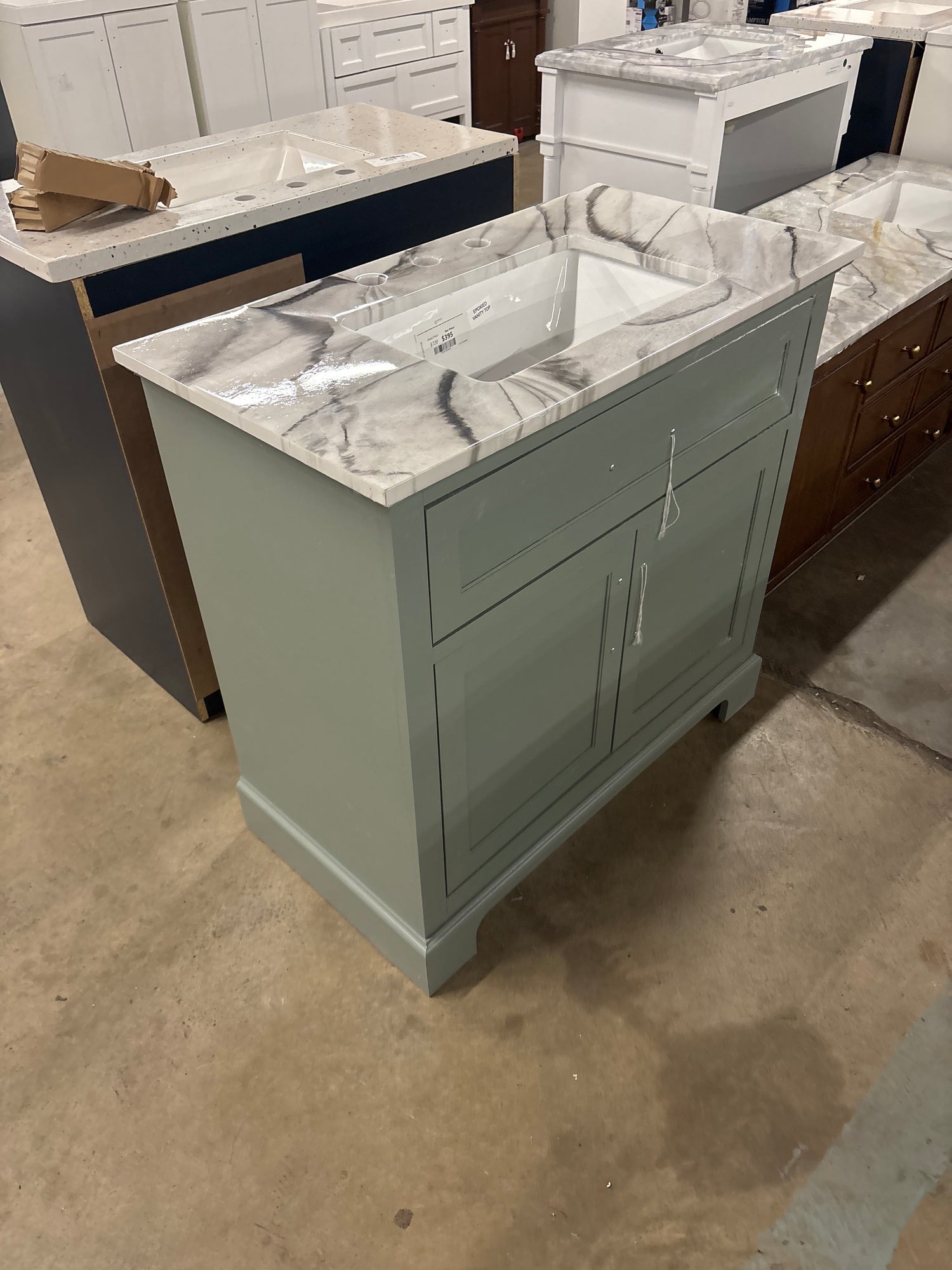 Doveton 36 in. Single Sink Sage Green Bath Vanity with White Epoxied Engineered Stone Top (Assembled) is backordered and will ship as soon as it is back in stock.