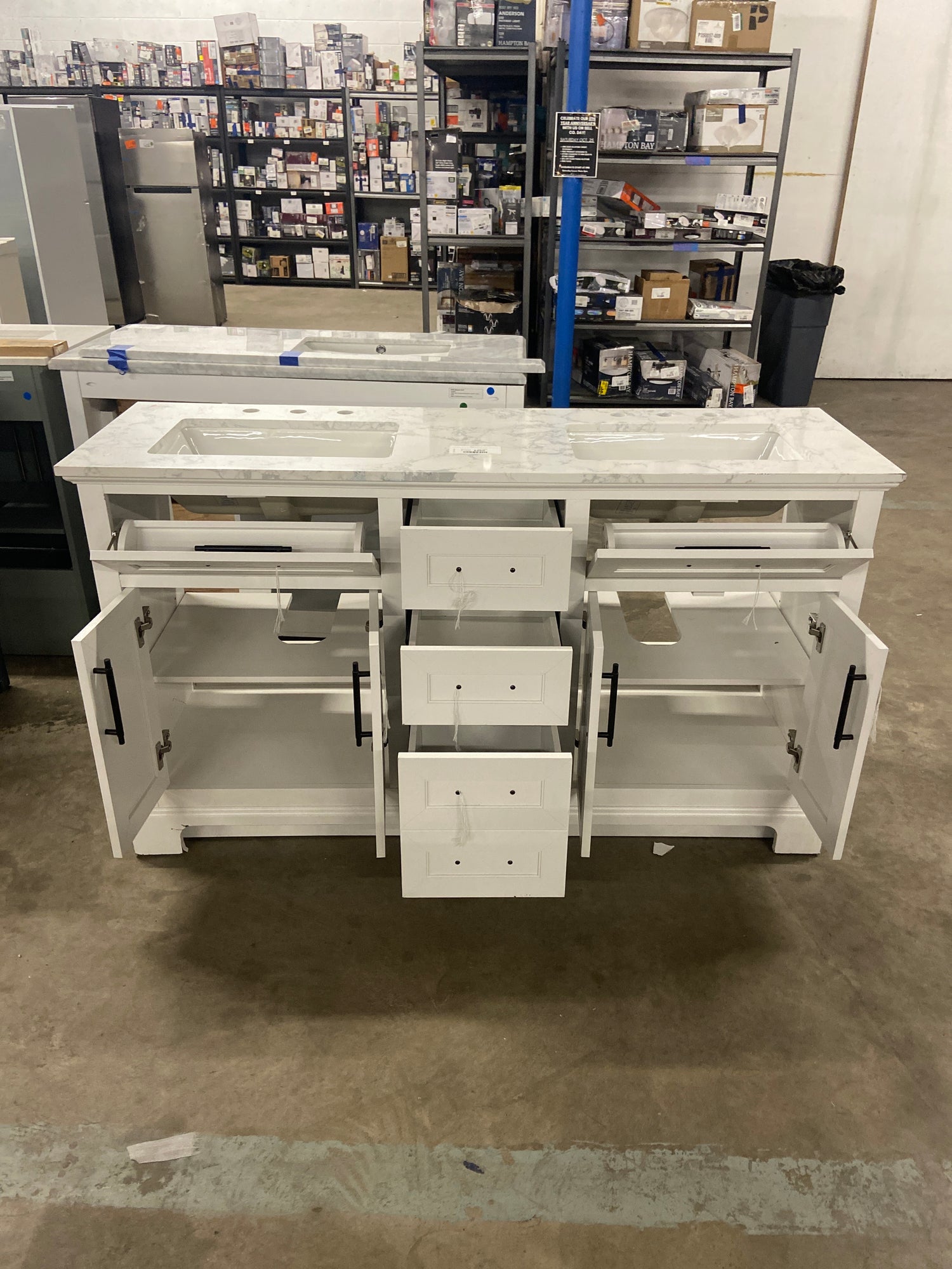 Doveton 60 in. W x 19 in. D x 34.50 in. H Bath Vanity in White with White Cultured Marble Top is backordered and will ship as soon as it is back in stock.