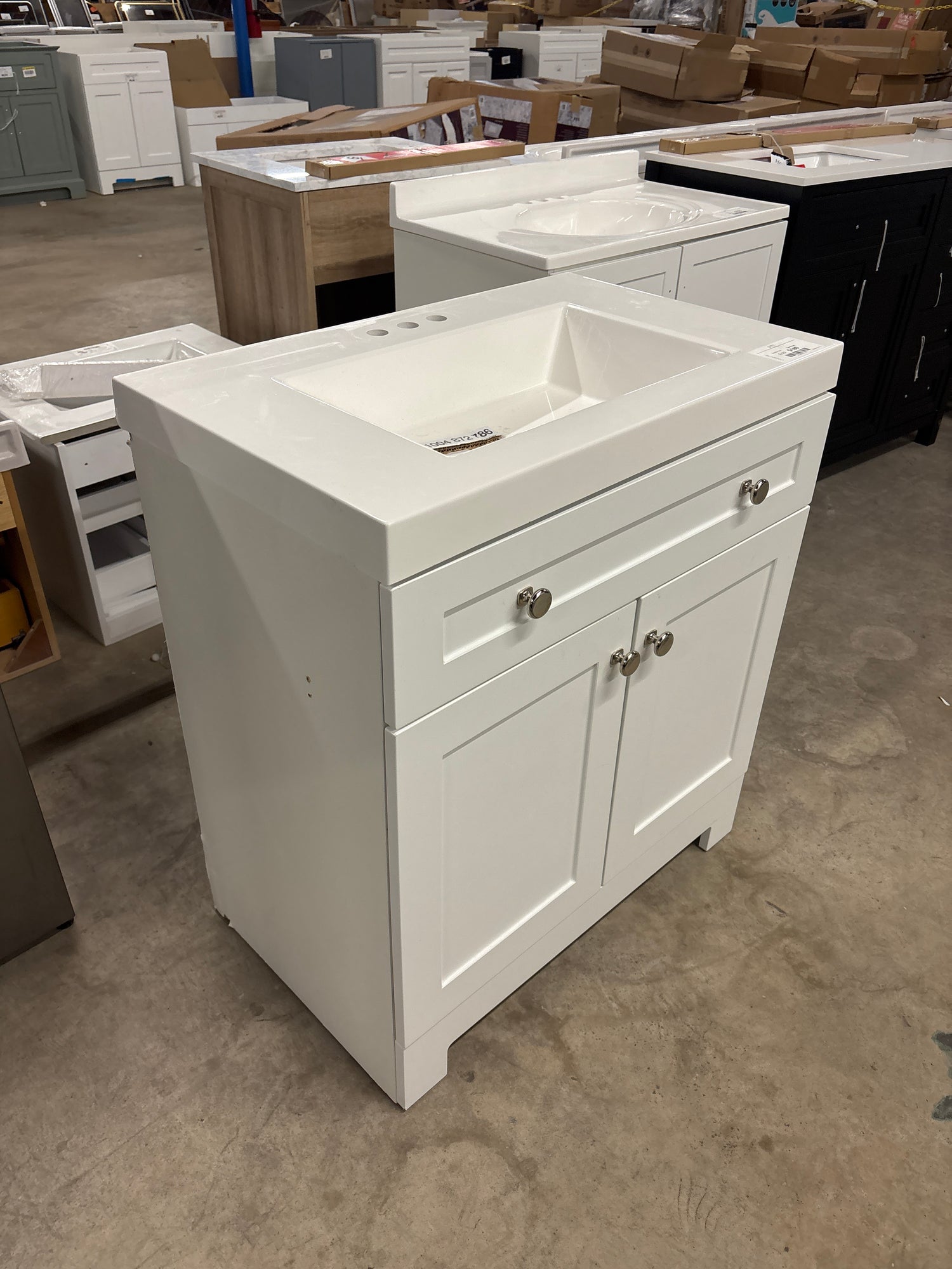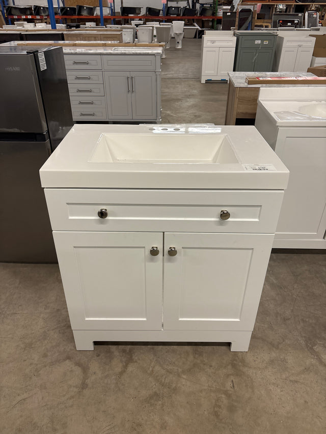 Everdean 31 in. W x 19 in. D x 34 in. H Single Sink Freestanding Bath Vanity in White with White Cultured Marble Top is backordered and will ship as soon as it is back in stock.