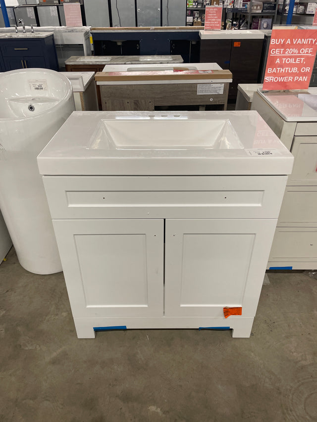 Everdean 31 in. W x 19 in. D x 34 in. H Single Sink Freestanding Bath Vanity in White with White Cultured Marble Top is backordered and will ship as soon as it is back in stock.