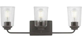 Evangeline 23 in. 3-Light Modern Bronze Farmhouse Bathroom Vanity Light with Clear Seeded Glass Shades delivers a captivating fusion of contemporary edge and rustic warmth. This three-light fixture casts an even, inviting glow across your mirror, elevating daily routines into a moment of quiet sophistication.