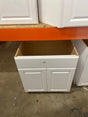 Hampton 30 in. W x 21 in. D x 34.5 in. H Assembled Bath Base Cabinet in Satin White without Shelf is backordered and will ship as soon as it is back in stock.