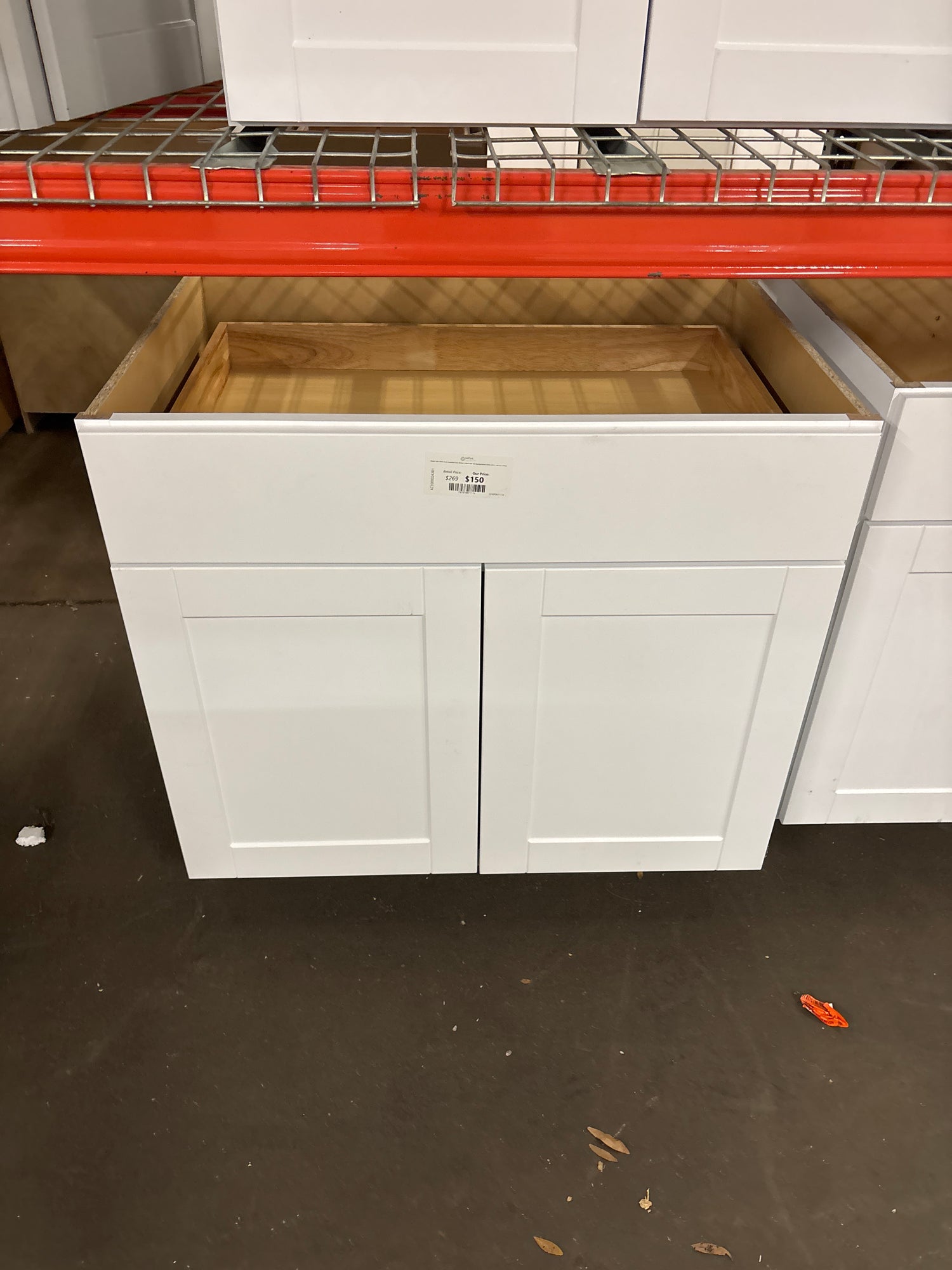 Shaker Satin White Stock Assembled Base Kitchen Cabinet with Ball-Bearing Drawer Glides (36 in. x 34.5 in. x 24 in.) is backordered and will ship as soon as it is back in stock.