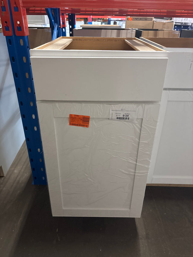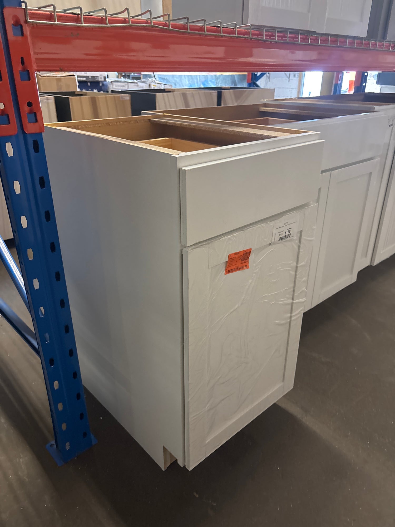 Westfield Feather White Shaker Stock Assembled Base Kitchen Cabinet (18 in. W x 23.75 in. D x 35 in. H) is backordered and will ship as soon as it is back in stock.