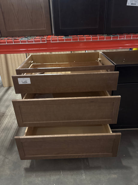 Sinclair 36 in. W x 24 in. D x 34.5 in. H Assembled 3 Drawer Base Cabinet in Shaker Saddle Oak