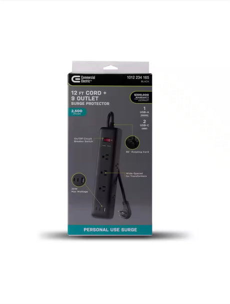 $10.00Unit price /UnavailableVery low stock (1 unit)12 ft. 9-Outlet Surge Protector with 1 USB-A and 2 USB-C, Black