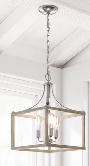 Boswell Quarter 14 in. 3-Light Brushed Nickel Farmhouse Square Chandelier with Painted Weathered Gray Wood Accents