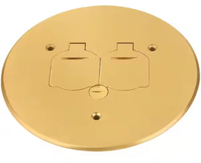 Low-Profile Round Floor Box Outlet Cover with 15A TR Duplex Receptacle and 2 Lift Lids, Brass