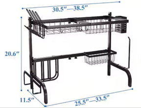 2-Tier Metal Steel Dish Drying Racks with Hooks, 25.5 in. to 33.5 in. Over the Sink Dish Drying Rack for Kitchen