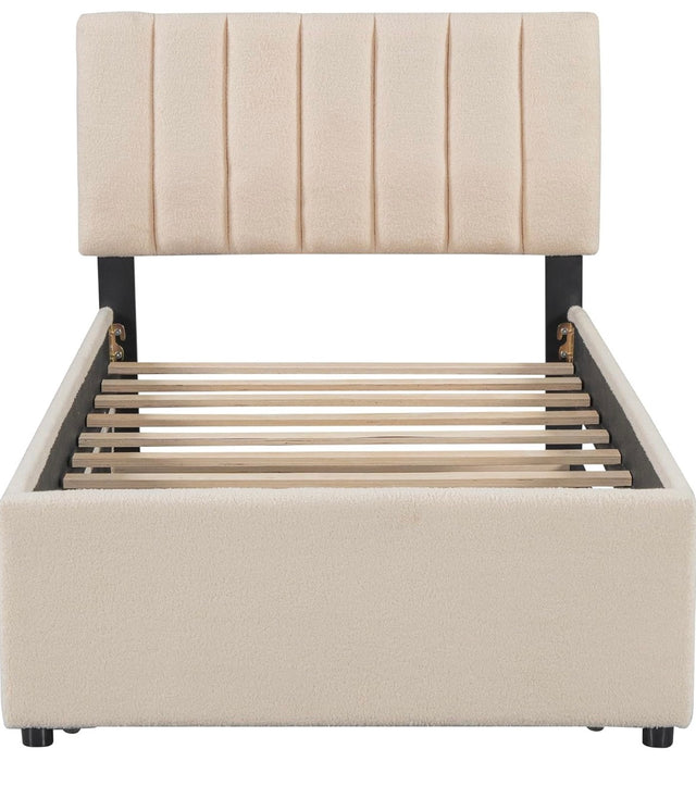 Teddy Fleece Twin Size Upholstered Platform Bed with Trundle, Remote-Control LED Lights, Solid Frame & Extra Sleeping Space (Beige, Twin)