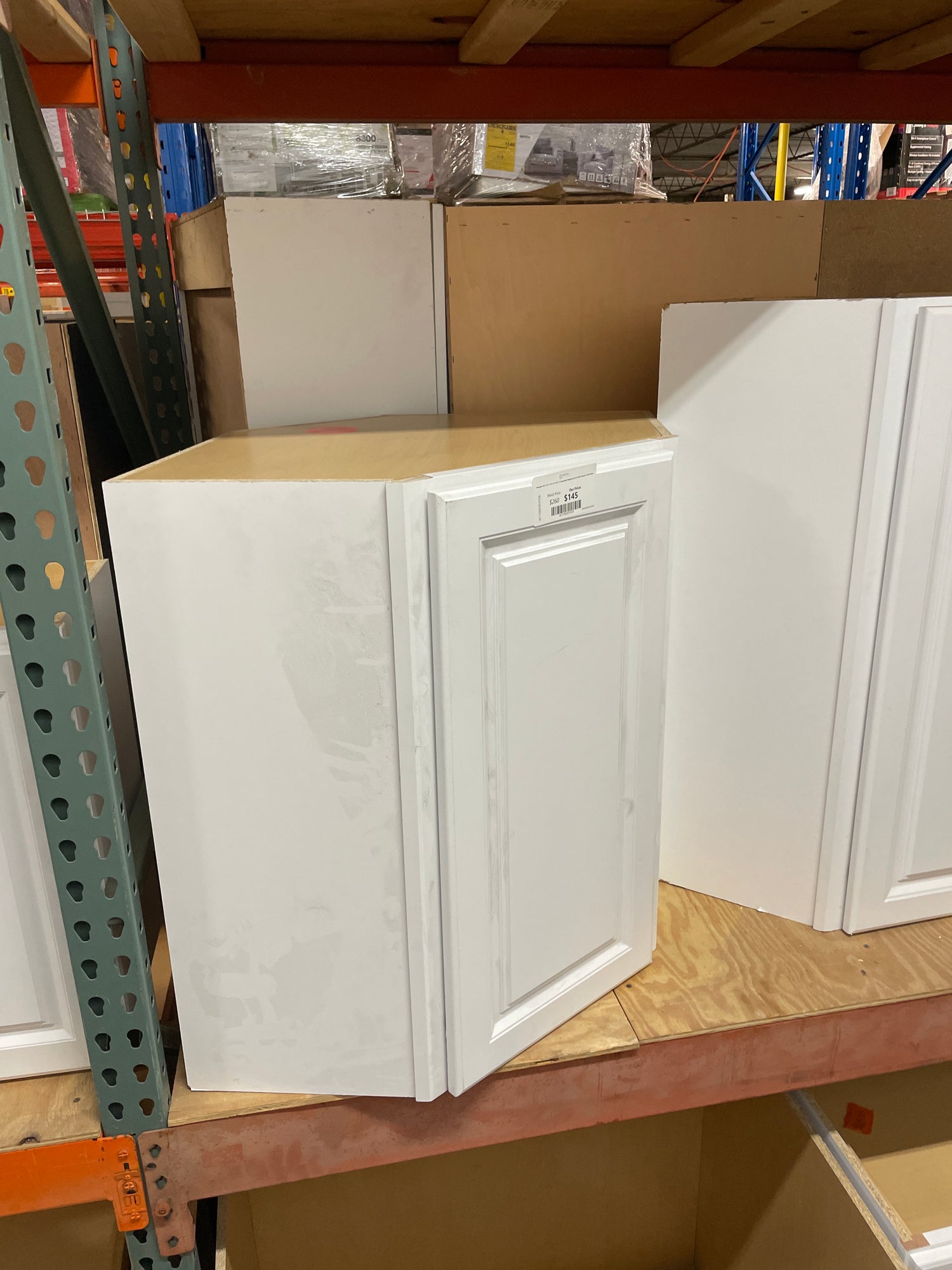 Hampton 24 in. W x 12 in. D x 30 in. H Assembled Diagonal Corner Wall Cabinet in Satin White is backordered and will ship as soon as it is back in stock.