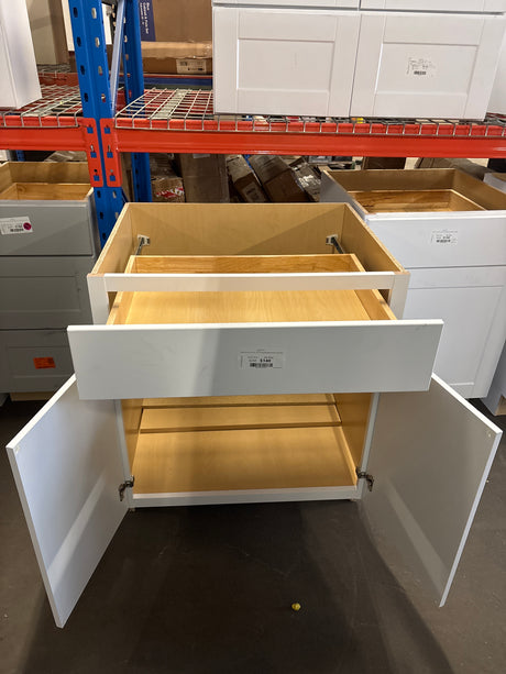 Regular price $155.00Unit priceUnavailable Shaker 36 in. W x 24 in. D x 34.5 in. H Assembled Base Cabinet in Satin White