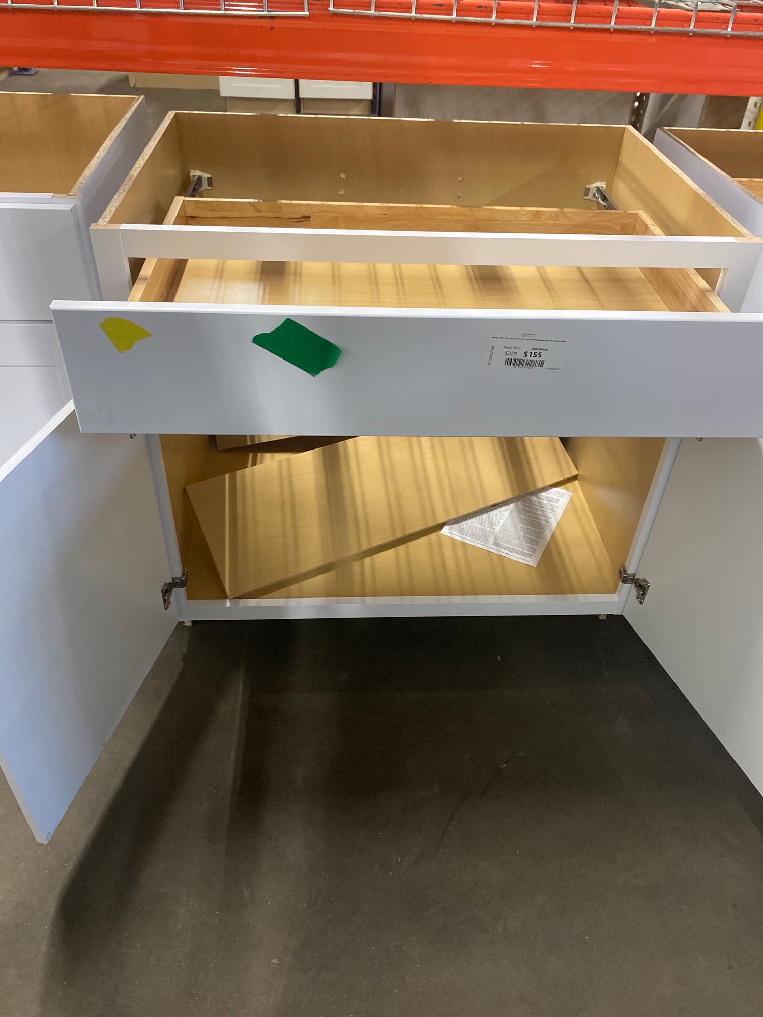 Shaker 36 in. W x 24 in. D x 34.5 in. H Assembled Base Cabinet in Satin White is backordered and will ship as soon as it is back in stock.