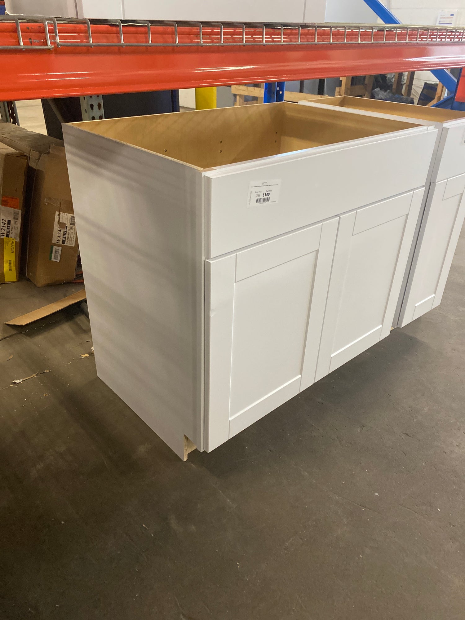 Shaker Satin White Stock Assembled Sink Base Kitchen Cabinet (36 in. x 34.5 in. x 24 in.)