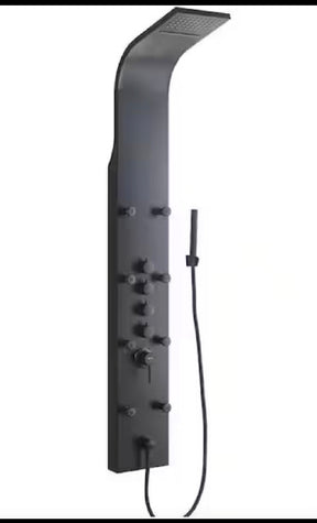 65 in. 8-Jet Rainfall Shower Panel System with Waterfall Shower Head and Shower Wand in Black Painted Stainless Steel is backordered and will ship as soon as it is back in stock.