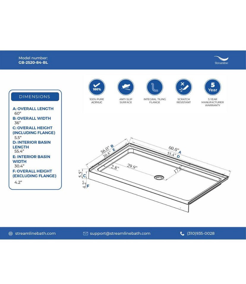 GB-2520-84-BL 60 in. x 36 in. Alcove Acrylic Shower Pan Base in Glossy Black with Center Drain, Drain Included is backordered and will ship as soon as it is back in stock.