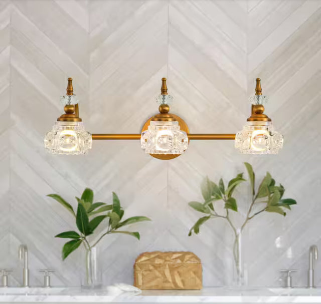 3-Light Vintage Bathroom Vanity Light Fixture Bathroom Lighting Antique Brass Gold Finish with Crystal Glass Shade
