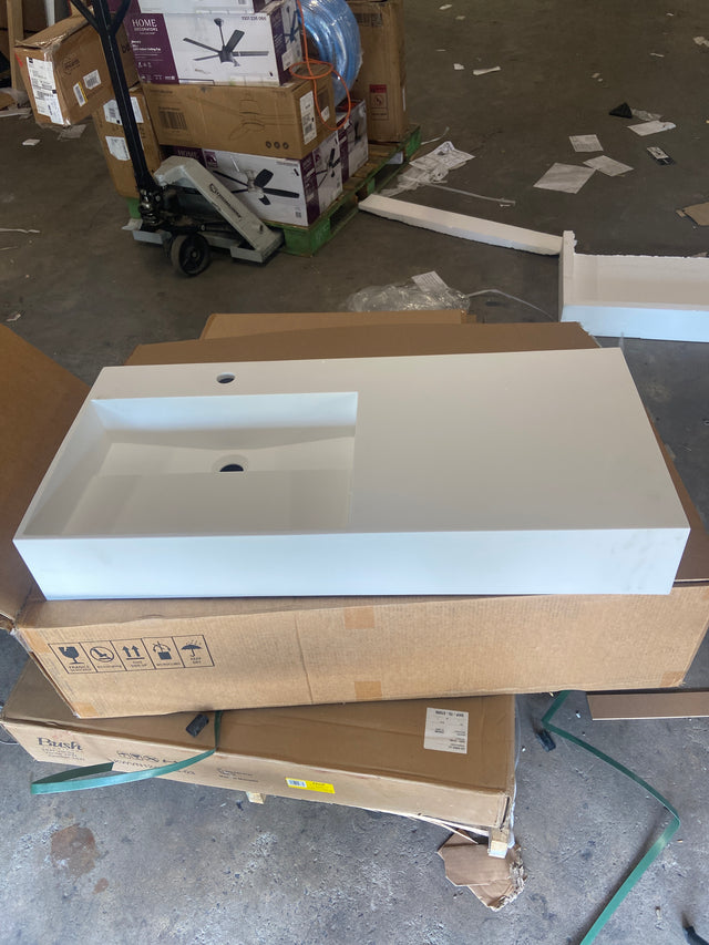 36” Wall Mount Solid Surface Left Side Bathroom Sink in Matte White. is backordered and will ship as soon as it is back in stock.