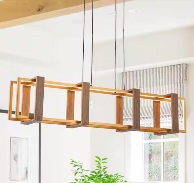 48-Watt 2-Light Gold Modern Linear Wood Integrated LED Pendant Light with Height Adjustable for Kitchen Island