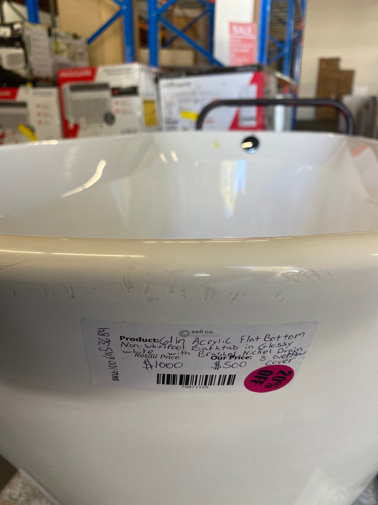 61 in. Acrylic Flatbottom Non-Whirlpool Bathtub in Glossy White with Brushed Nickel Drain and Overflow Cover is backordered and will ship as soon as it is back in stock.