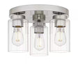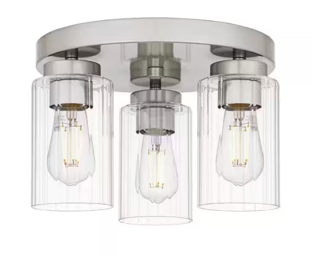 Delphi 13.25 in. 3-Light Brushed Nickel Contemporary Flush Mount with Clear Ribbed Glass Shades